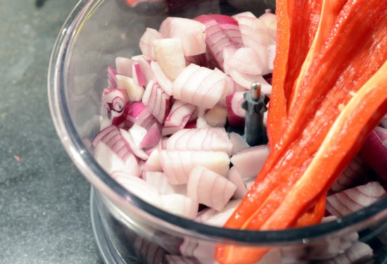 - Meanwhile, in a food processor, blend the garlic cloves, roughly chopped onion, red pepper and ginger with one tablespoon of water to a fine paste.