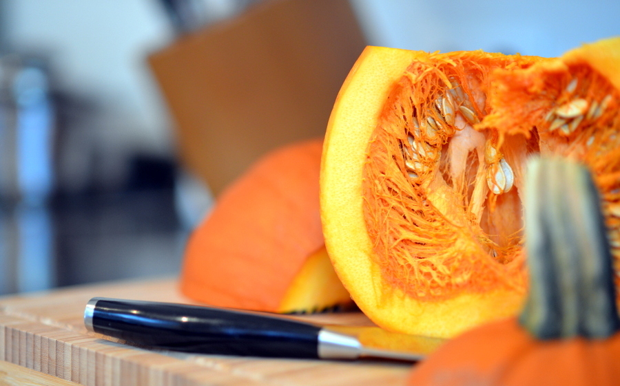- Take the skin off the cooled pumpkin wedges, place the flesh in a bowl and set aside