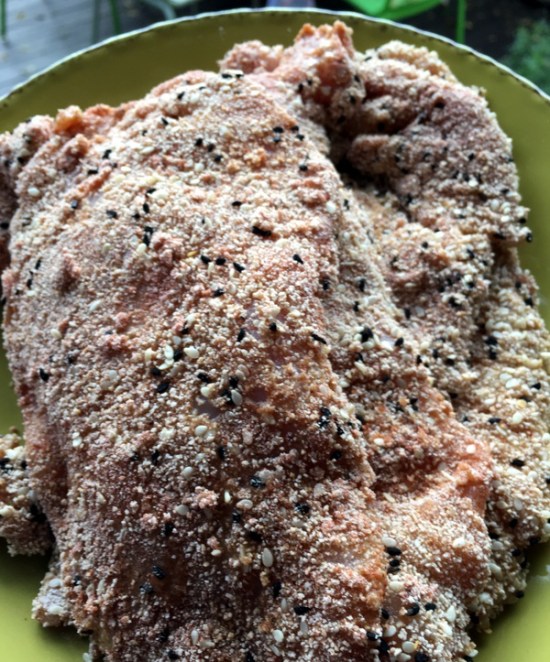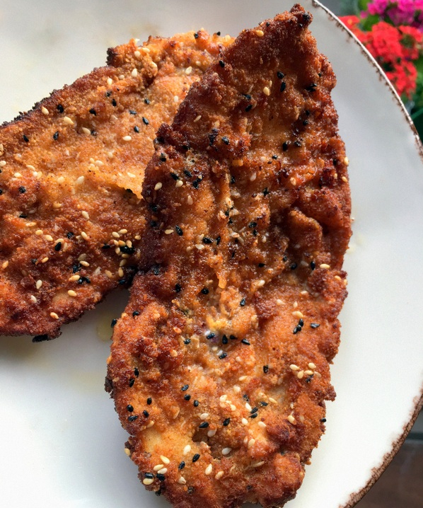 Continuing with Chicken Week, I am happy to bring one of my favourite chicken dishes. This is a quick and easy recipe. A new way to eat chicken breast and the kids just love the crunch that comes from the sesame seeds. It is a simplified version of a traditional schnitzel but I personally like to use sesame and nigella seeds (aka black cumin) in the flour mix. I will also admit to adding a bit of smoked paprika in the mix, to give it another dimension of flavour. It is a fried dish, but because it is shallow fried it is much lighter than expected. I serve this with a simple salad and plain spaghetti.