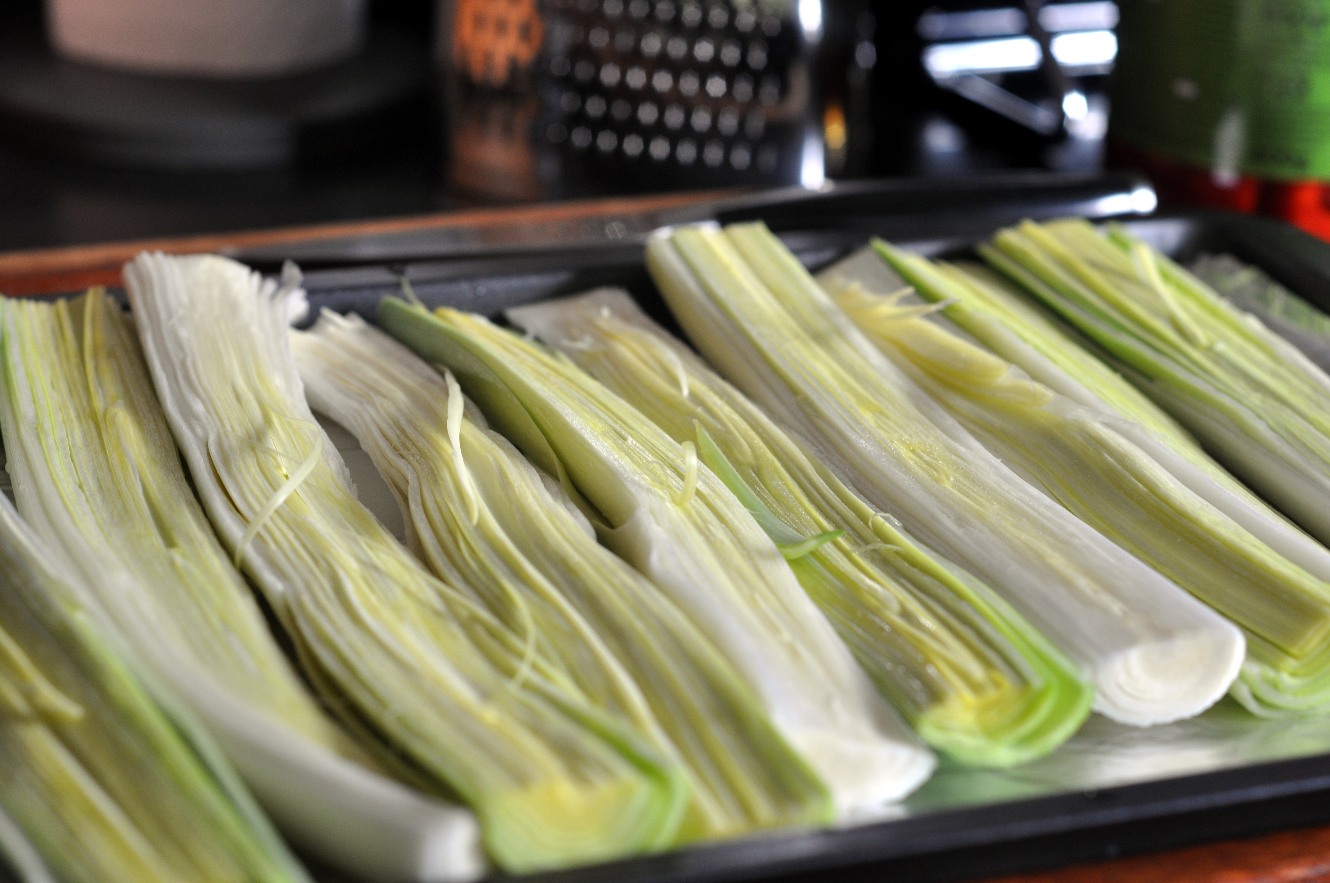 2. Cut the leeks cut into halves and lay it down on a the tray
