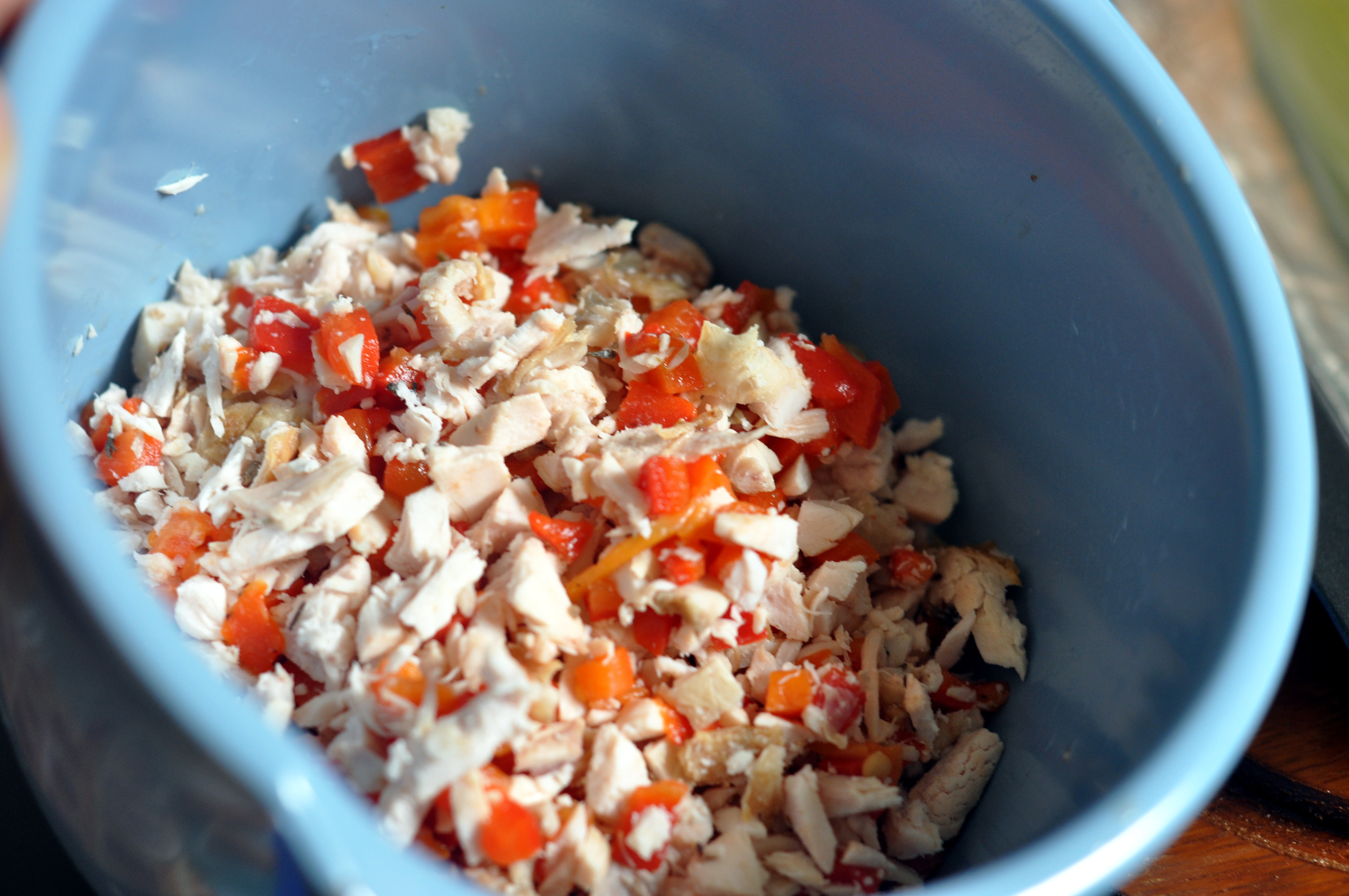 4. In a separate bowl:  Mix the chicken and the red peppers and the chilli powder