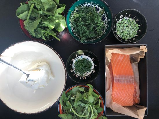 - Now make the cream cheese mix. Add dill, watercress (or roquette) lemon zest and juice, and some freshly ground pepper into a bowl and mix well, then set aside
