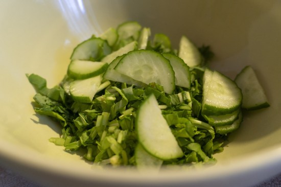 - 1 salatalık, soyulmuş, , ince ince dilimlenmiş