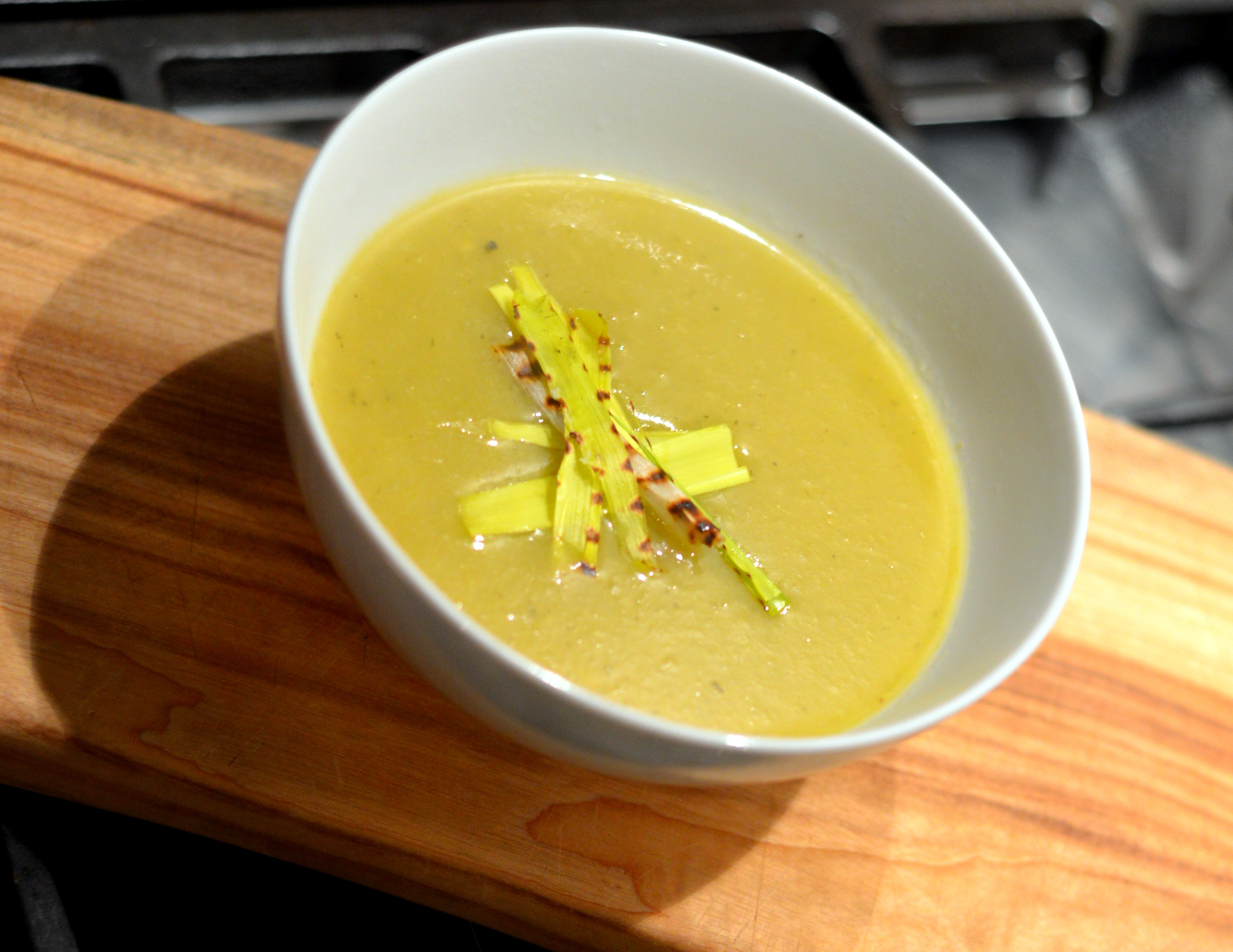 - Heat the soup through and serve with the chives and the grilled leek