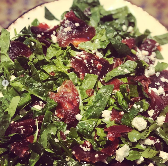- Slice the beetroot very fine (I use a mandolin to get it paper thin) Add it to the salad