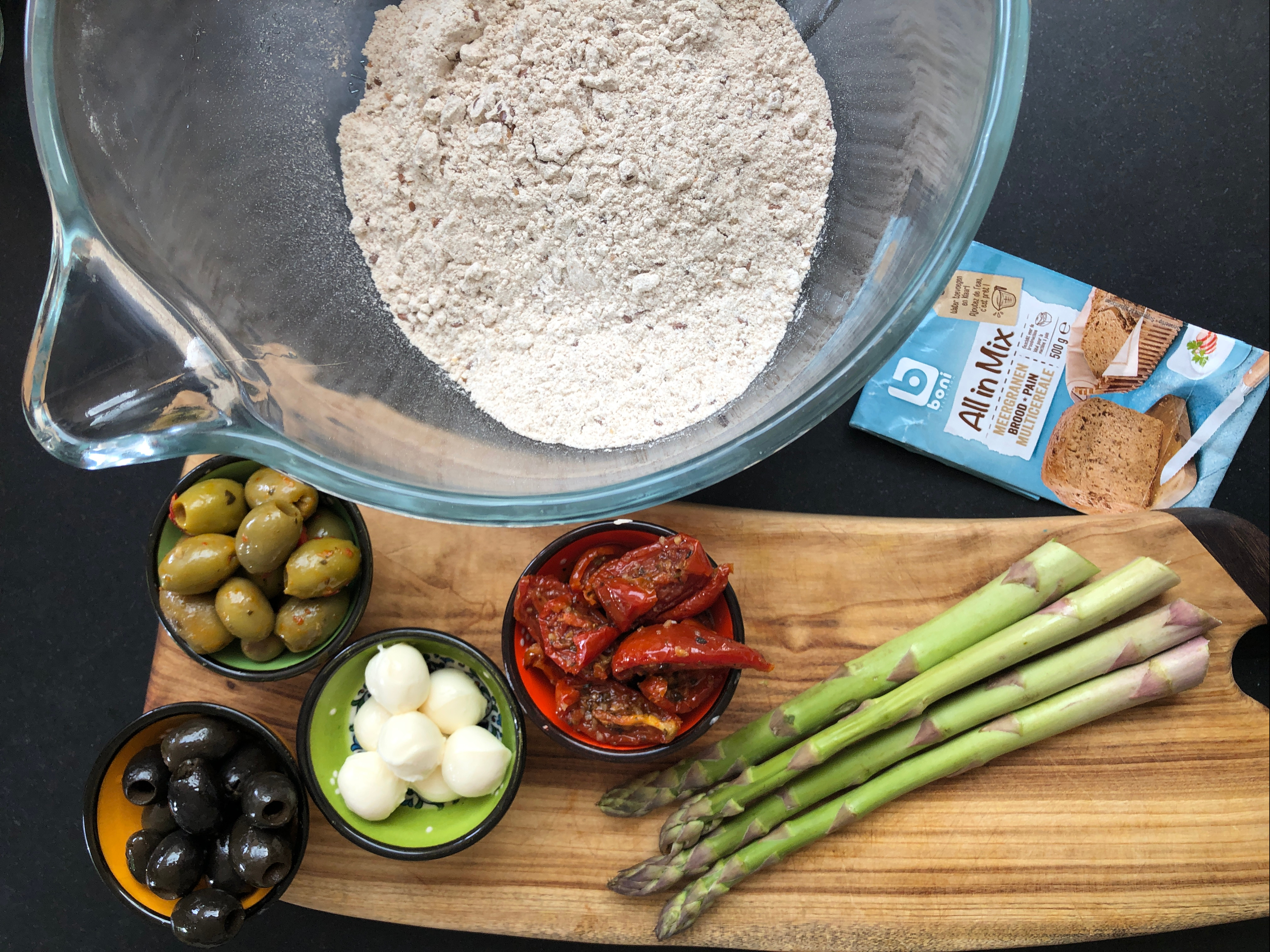 - Once the resting is over, it is time mix all the ingredients to the dough. Place all the ingredients in a separate bowl, mix it well (Reserve 5 asparagus tips and a few olives for the top for later)