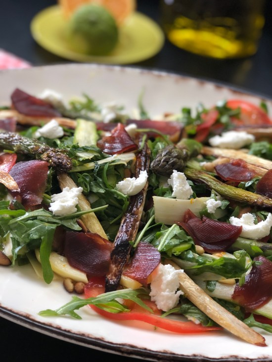 - Mix in half the dressing to the raw mix and then layer it over the grilled asparagus and the goat’s cheese on the plate