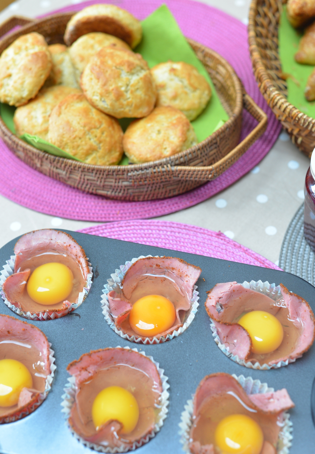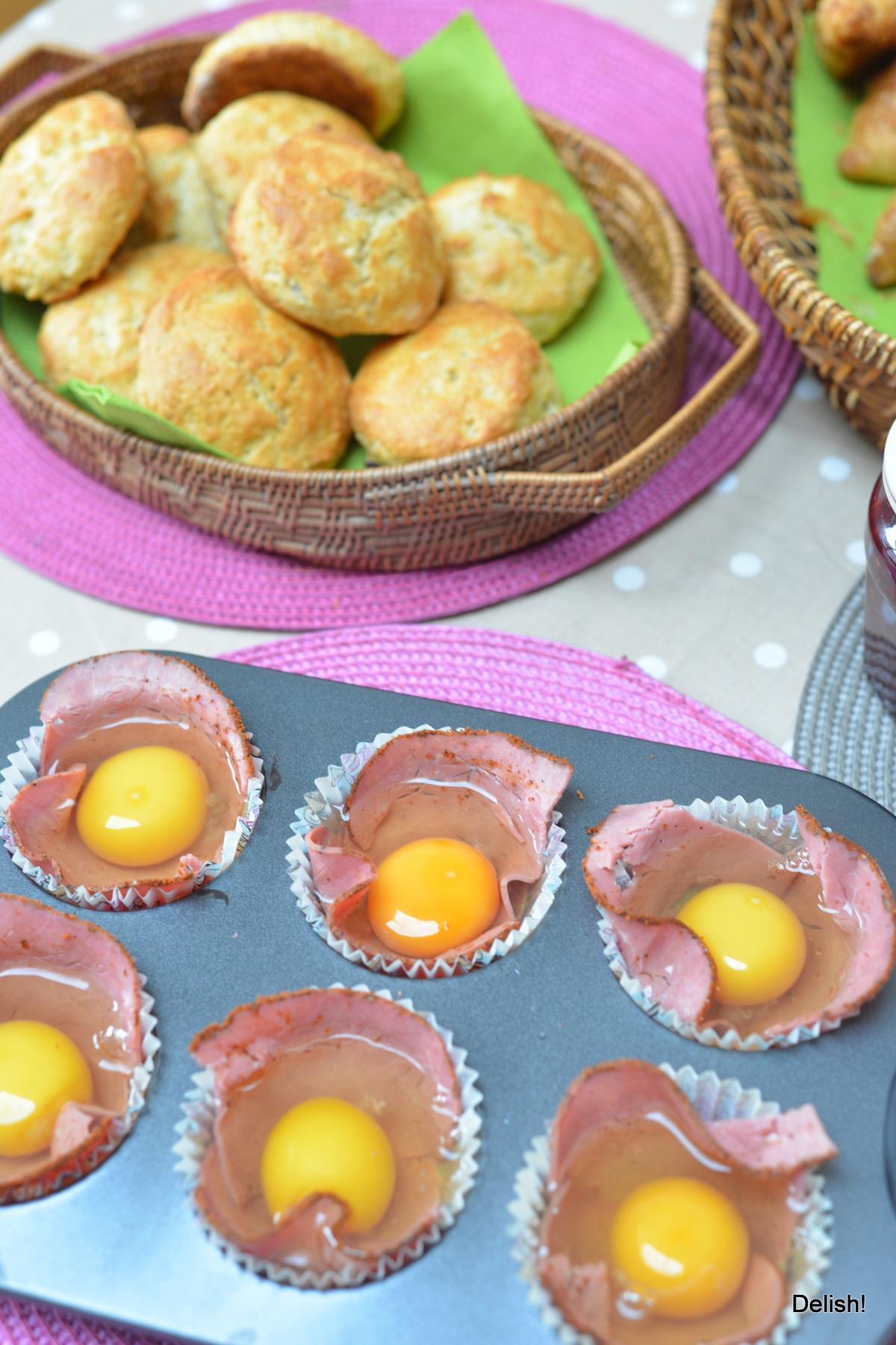 Just in time for Mother’s day, here is a little breakfast treat. A new take on bacon and eggs. Especially because you don’t need to use bacon. You can use pastrami, just like I did, or even spinach leaves if you want a vegetarian option. One tip is to decide on how hard or runny you would like your eggs because if they are too hard, it becomes a bit too heavy to eat. I made these for a brunch with friends and they flew off the tray in no time.